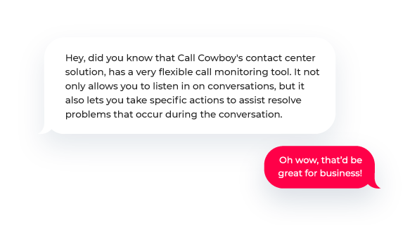Call Cowboy's contact center solution, for example, has a very flexible call monitoring tool. It not only allows you to listen in on conversations, but it also lets you take specific actions to assist resolve problems that occur during the conversation. Advanced call monitoring features such as call whisper, call barge, and call takeover may be utilized to limit what you receive from your customer service representative: